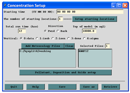 The concentration setup menu is shown below for the example at the beginning of this section (NAM 12 km data, release 28.5N 80.7W 10m, 12 h emission and simulation, snapshot concentration after 12 h, Top-hat puff, and 5000 particles – the Advanced / Configuration Setup / Concentration menu).