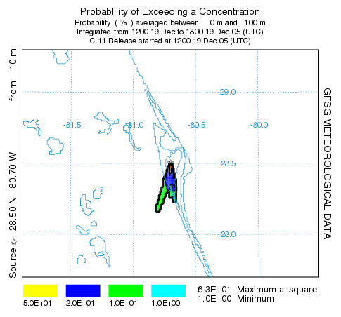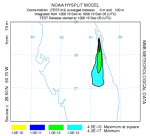 Instead of creating a single deterministic air concentration simulation, several programs are included with HYSPLIT that can be used to combine multiple HYSPLIT simulations into a single graphic that represents some variation of a concentration probability. The simplest approach is to run the model multiple times varying some parameter. In the first case the model is run with multiple meteorological data. Each simulation was from 28.5N, 80.7W at 10 m. Also, to convert these data to a probability format below, the binary output files must be named with the suffix .001, .002, etc. in the Definition of Concentration Grid 1 menu. The 6-h average concentration graphic for each meteorological data set is given below for data from the NAM 12 km, the NAM 40 km, the RUC 20 km, the AFWAMM5 15 km, the AFWAMM5 45 km, and the GFS 1 degree. Notice that the NAM and RUC results show more of an westward component than the other 3 model results.
