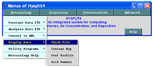 File characteristics and projectionHYSPLIT requires that meteorological data fields be projected on a conformal map projection (Polar Stereographic, Lambert, or Mercator) or a regular latitude-longitude grid. The data must be organized with one record per variable per level and all records must have the same record length. Records are written in a forward time sequence. More details on the format and packing of the meteorological data can be found in the HYSPLIT User's Guide.The \exec directory contains several command line programs (chk_data, chk_rec) that can be used to analyze a HYSPLIT compatible meteorological data file. chk_file has been incorporated into a HYSPLIT GUI under the Meteorology / Display Data menu.