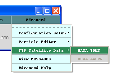 Next, exit from the particle editor and choose NASA TOMS from the Advanced / FTP Satellite Data menu. A TOMS aerosol index file can be automatically downloaded from the NASA web site, or a NOAA AVHRR file of optical depth over the oceans can be downloaded from NOAA, if available (more details on these files is provided in the User’s Guide). Enter a valid email address, fill in the blanks for the February 27, 2000 data, and then click on Get Data File. When the ftp is finished, click on the continue button.